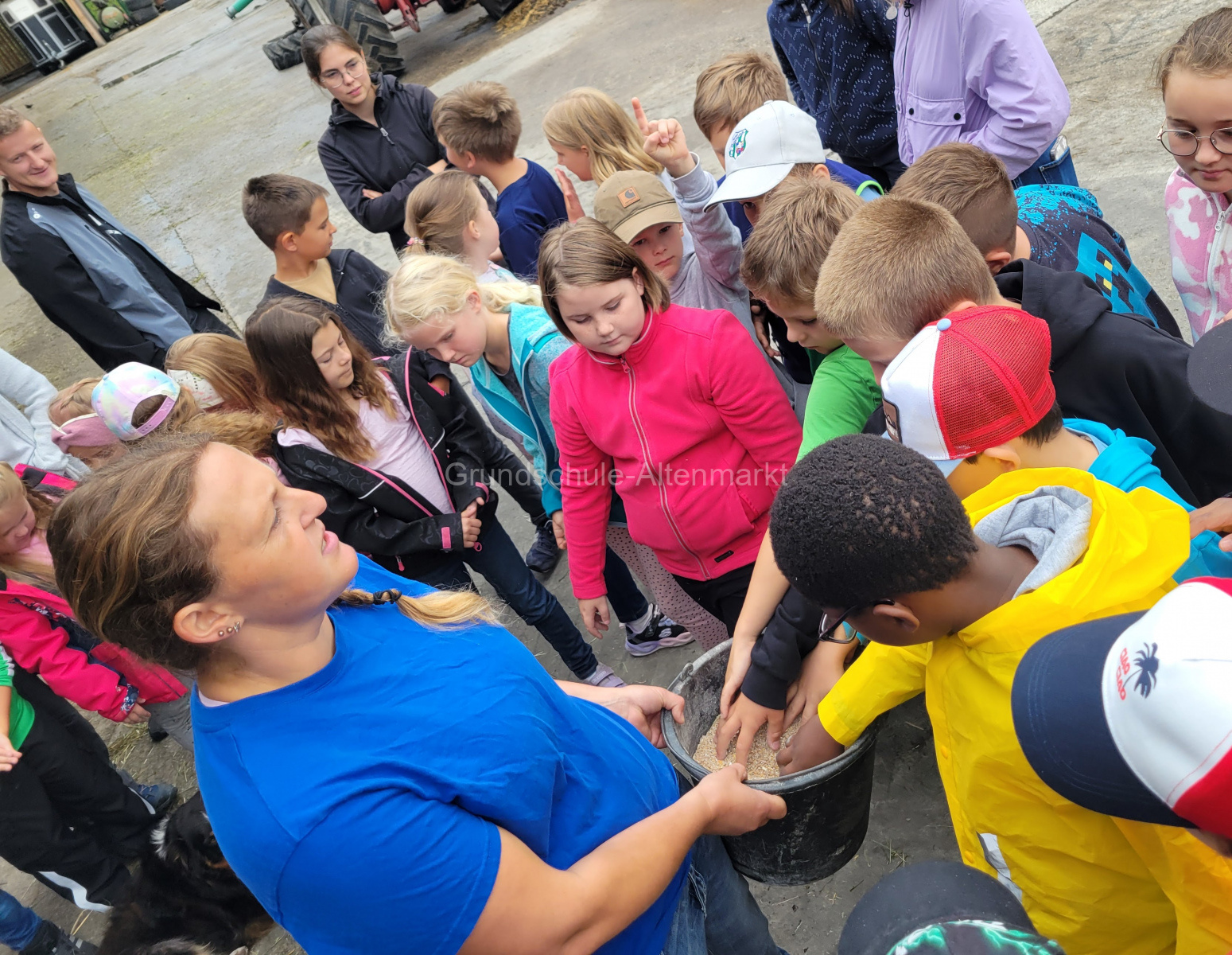 Nach so viel Hofarbeit war die Pause in der Maschinenhalle mehr als verdient – und der Appetit riesig. Dann ging es weiter mit dem zweiten Themenschwerpunkt des Tages: Getreide. An mehreren Mitmachstationen lernten die Kinder die wichtigsten heimischen Getreidearten kennen, untersuchten die Körner, ordneten sie verschiedenen Lebensmitteln zu und mahlten sogar ihr eigenes Mehl von Hand. An einer anderen Station wurde süßes Popcorn frisch gebraten – ein duftender Abschluss dieser spannenden Einheit. Wer schwindelfrei war, wagte sich sogar auf den mächtigen Mähdrescher und bekam ein Gefühl für die Dimensionen moderner Landwirtschaft.