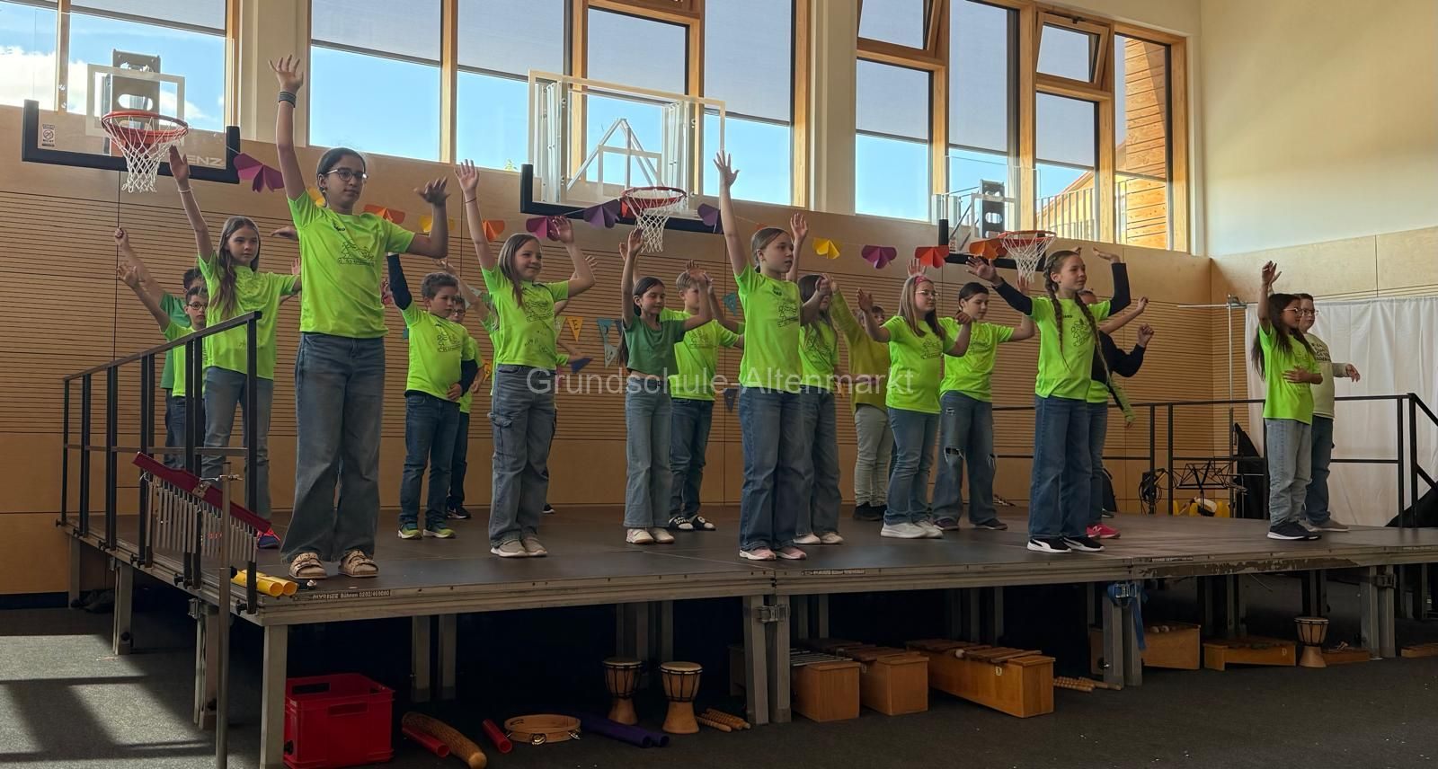 Zahlreiche musikalische Beiträge wie „Der tanzende Alpaka (2aG und 2c), der Fische Blubber Song (2b) oder das Lied der langen Schlangen (Klasse 1d) wurden abgewechselt von Tanzeinlagen wie z.B. einem Line Dane der Erstklässler und dem Tanz „you made me look“ der Klasse 4aG. Bei der Neuinszenierung des Liedes „Im Walde von Toulouse“ als Tanztheater zeigte die Klasse 4c ihr schauspielerisches Geschick, das im Publikum sogar zum Gruseln anregte. Zwischen den Beiträgen der Klassen sorgten die Flötenkinder der ILE-Musikschule immer wieder für Begeisterung mit ihren Stücken. Für eine willkommene Auflockerung sorgte die Klasse 3b mit dem Körperteile- Blues, den auch die Zuschauer fleißig mitmachten. Weitere Stücke wie das Lied „Der Kuckuck und der Esel“, vorgetragen von dem Chor der Klassen 1 / 2 unter der Leitung von Frau Schmid Liselotte oder der „Wellerman Song“ der Klasse 3c ernteten großzügig Applaus. Staunend wurden die Percussion – Polka der Klasse 4b und die Umsetzung von „Soco Bace Vira“ vom Publikum mitverfolgt. Die Aussagen im Lied des Chores „Wir sind Wunderkinder“ bekräftigte Frau Anthofer in ihren Schlussworten. Nach den Dankesworten von Frau Anthofer, die sich an alle, die zum Gelingen des Festes beigetragen hatten, richteten, folgte der kulinarische Teil des Festes: Der Elternbeirat um Manuela Wotsch und Carola Schweizer hatten allerhand zu bieten: Von Grillteller über Wurstsalat, Eis, Kaffee und Kuchen ließ das reichhaltige Angebot, das durch die Mithilfe Vieler präsentiert werden konnte, kaum Wünsche offen.