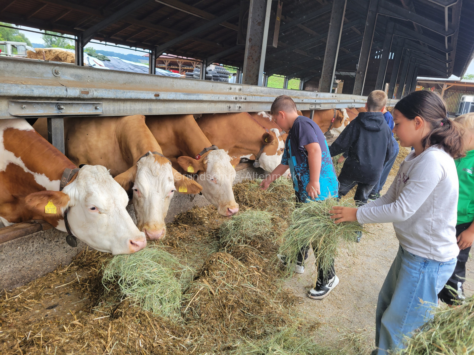 Begrüßt wurden die zweiten Klassen und die Deutschklasse von Bäuerin Franziska Pfeffer, ihrer Auszubildenden Anna – und einer flauschigen Assistentin auf vier Pfoten: Australian Shepherd Maya, die sich mit ihrem Charme und ihrer Gutmütigkeit schnell in alle Kinderherzen kuschelte. Auf dem Programm stand jeweils ein vielfältiger Bauernhofvormittag rund um die Themen Rinderhaltung und Getreide.  Die jungen Besucher durften Rinder füttern, die verschiedenen Futtersorten – von duftendem Heu über fermentierte Silage bis hin zur sogenannten „Schokolade“ für Kühe (eine Mischung aus Getreide und Zuckerrübenpellets) – bestaunen und in zahlreichen Situationen selbst Hand anlegen.
