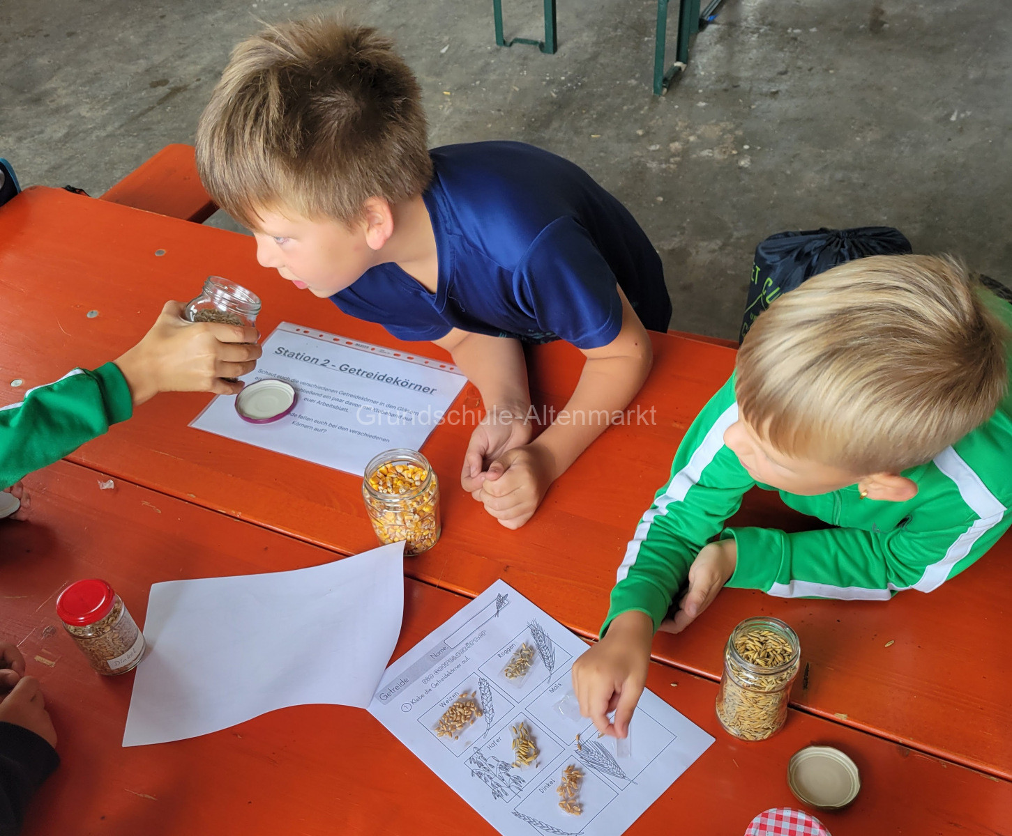 Nach so viel Hofarbeit war die Pause in der Maschinenhalle mehr als verdient – und der Appetit riesig. Dann ging es weiter mit dem zweiten Themenschwerpunkt des Tages: Getreide. An mehreren Mitmachstationen lernten die Kinder die wichtigsten heimischen Getreidearten kennen, untersuchten die Körner, ordneten sie verschiedenen Lebensmitteln zu und mahlten sogar ihr eigenes Mehl von Hand. An einer anderen Station wurde süßes Popcorn frisch gebraten – ein duftender Abschluss dieser spannenden Einheit. Wer schwindelfrei war, wagte sich sogar auf den mächtigen Mähdrescher und bekam ein Gefühl für die Dimensionen moderner Landwirtschaft.