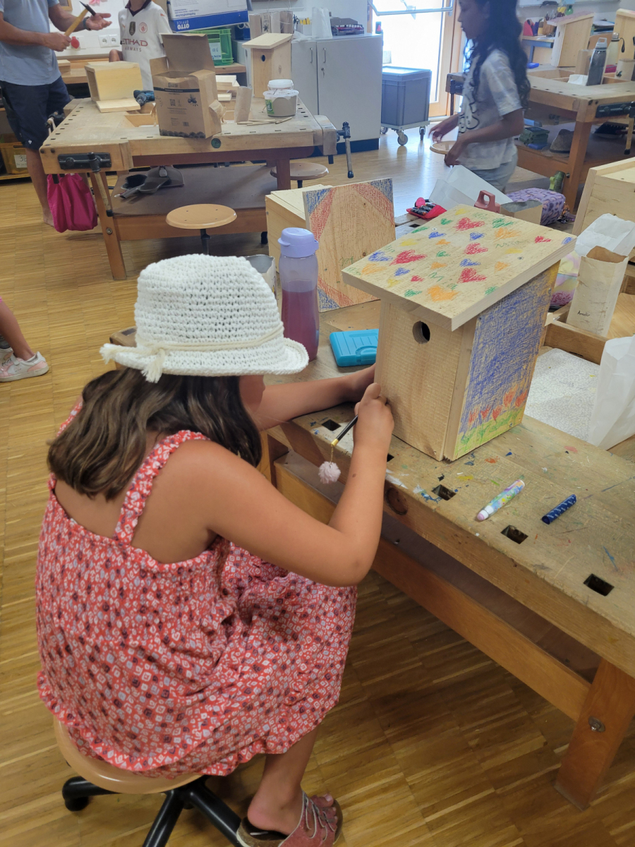 Auch für Gartenvögel wurde fleißig gewerkelt: Nistkästen für Höhlenbrüter, gefertigt aus passgenau vorbereitetem Holz, das von der Firma Holzbau Krenn großzügig gespendet wurde, finden nun ihren Platz im schulischen Baumbestand – und zu Hause in den Gärten der Kinder. Hier wurde ebenfalls in jeder Hinsicht versucht, die bestmögliche Umsetzung zu finden: Statt mit Dachpappe, deren Einzelteile nach Jahren oft noch im Boden zu finden ist, versiegelten die jungen Umweltschützer ihre Häuschen individuell mit Wachsmalstiften und ließen so individuelle Kunstwerke entstehen.